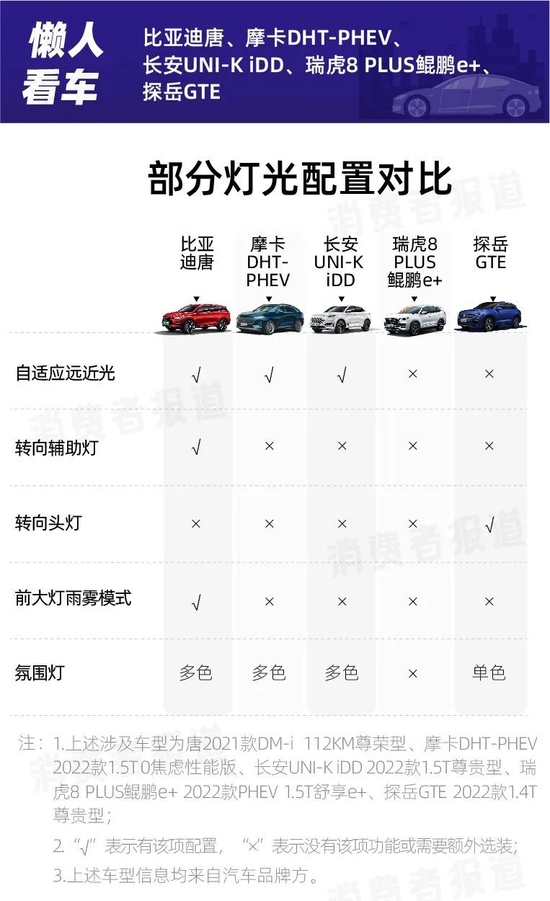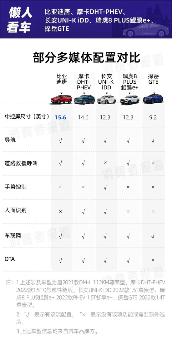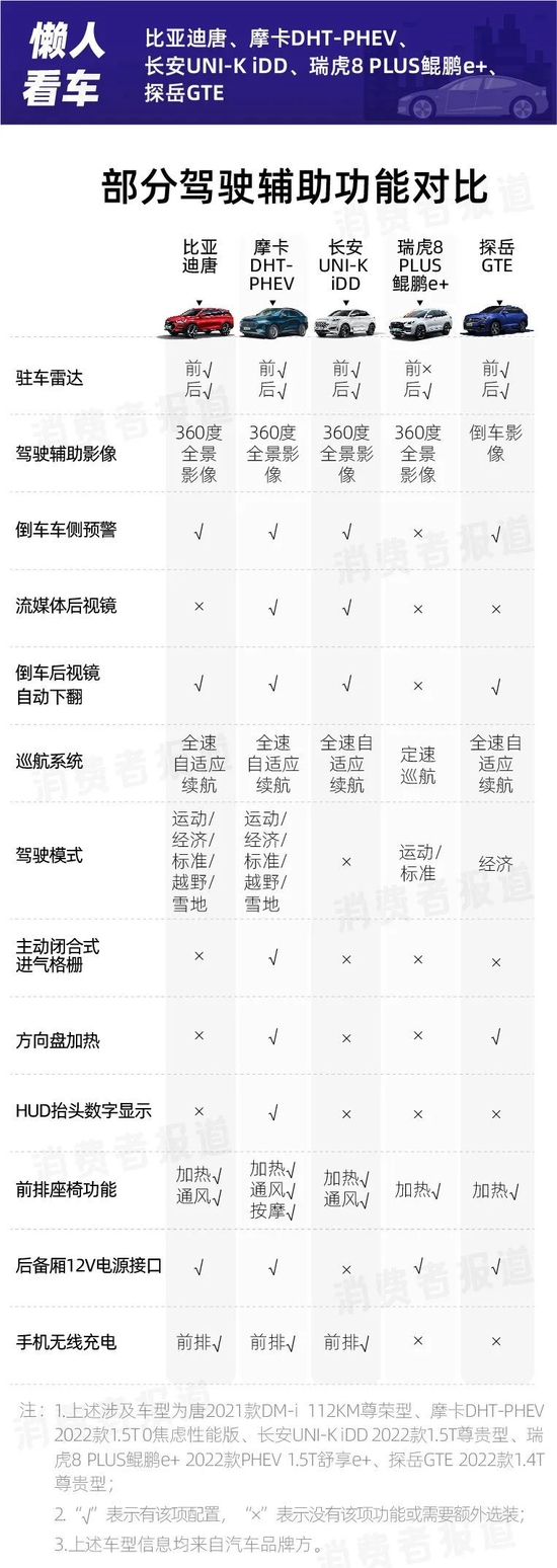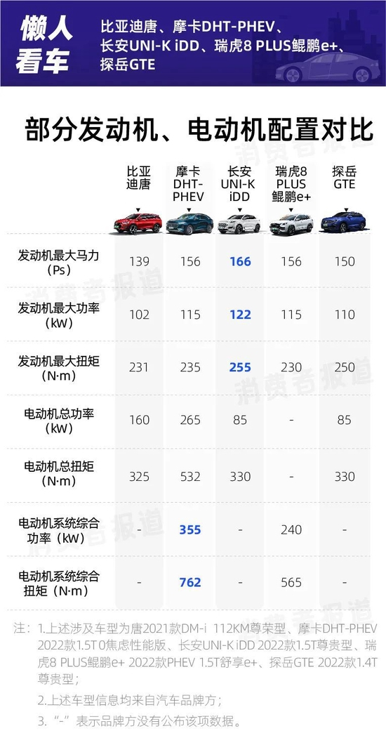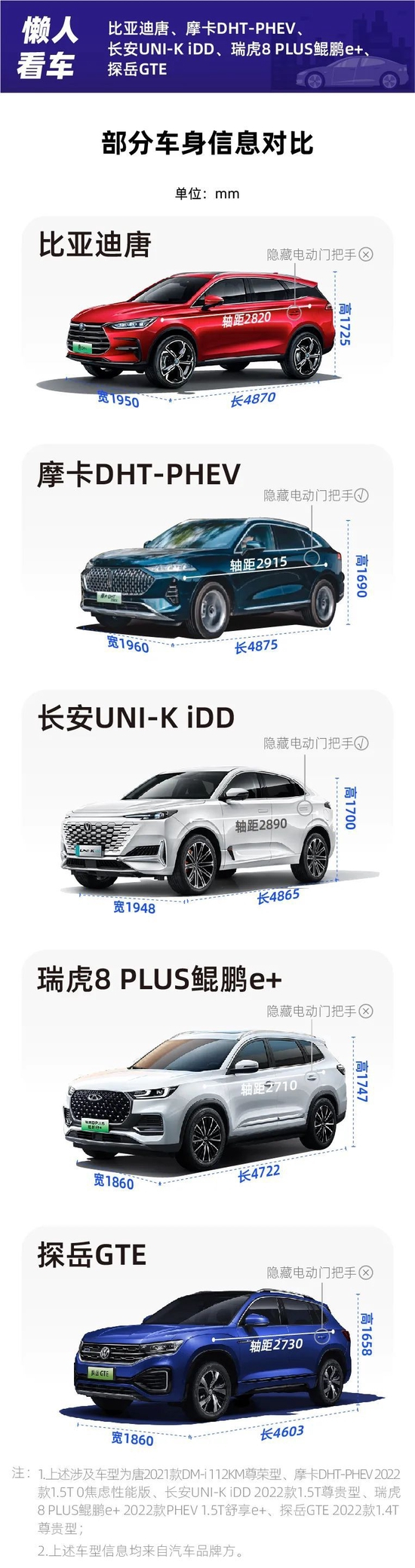 此次对比,我们选取唐2021款DM-i 112KM尊荣型(以下简称“比亚迪唐”)、摩卡DHT-PHEV 2022款1.5T 0焦虑性能版(以下简称“摩卡DHT-PHEV”)、长安UNI-K iDD 2022款1.5T尊贵型(以下简称“长安UNI-K iDD”)、瑞虎8 PLUS鲲鹏e+ 2022款PHEV 1.5T舒享e+(以下简称“瑞虎8 PLUS鲲鹏e+”)、探岳GTE 2022款1.4T尊贵型(以下简称“探岳GTE”)。