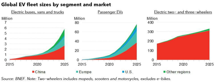 根据彭博另一份电动车行业的报告,全球电动车销量将从2021年的660万辆,上升至2025年的2060万辆,其中中国市场是推动发展的主力市场。