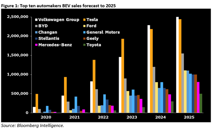 根据该报告,从今年起,中国的比亚迪在全球电动车销量榜中牢牢握住第三位置,之后将是其他传统汽车制造商们的竞争,至2025年他们每家的年销量预计将在100万量左右浮动。直到十年后,来自美国或日本的传统汽车制造商才可能挑战第三名的位置。