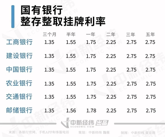 中新经纬记者查询了六大国有行的官网和APP发现,除了邮储银行之外的五大国有银行,整存整取的存款产品挂牌年利率基本一致,三个月、半年、一年、两年、三年、五年的存款年利率分别为1.35%、1.55%、1.75%、2.25%、2.75%、2.75%。邮储银行仅半年期和一年期产品利率略高,分别为1.56%和1.78%。