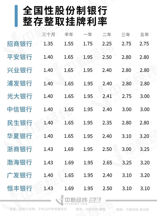 12家全国性股份制银行和10家城商行的存款利率稍高于国有行。中新经纬通过银行官网、手机APP和客服电话,整理了部分银行整存整取产品的挂牌利率。