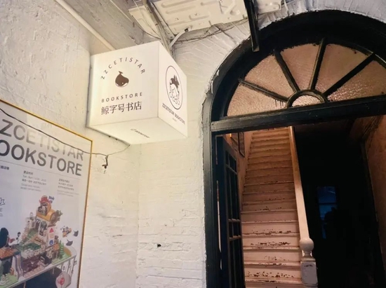 自忠路414号,是一栋联排的西式洋房,隔壁420号就是国画家黄宾虹的故居。一楼理发店的灯柱抢眼,鲸字号书店则仿佛隐身,只有楼梯入口处的暖白色灯箱和海报提示你:书店到了,请上二楼。