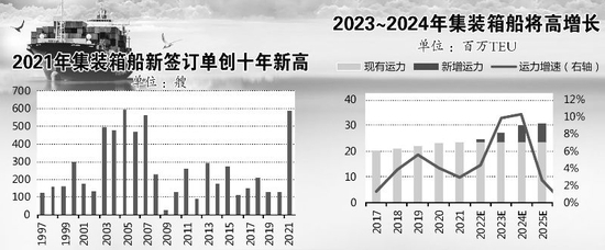 Alphaliner报告指出,目前的集装箱船舶的订单量约900艘,已经创下班轮航运史上最大的订单规模;新造船订单的运力之和超过了世界第四、第五和第六大班轮企业现有船队的总和;订单船舶运力与现有船舶的运力占比更是从2020年10月的8.2%上升到了2022年5月的27%。另据国泰君安统计,根据目前交付计划,预计2023~2024年8000箱以上大船(主要运营欧美航线)运力规模将进入两位数高增长期。