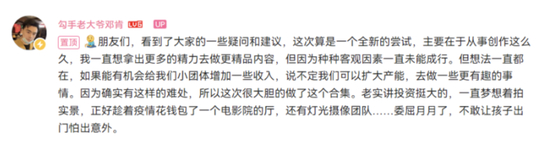 对于外界的质疑,UP主“勾手老大爷邓肯”也进行了回应:“这次算是一个全新的尝试,主要在于从事创作这么久,我一直想拿出更多的精力去做更精品内容,但因为种种客观因素一直未能成行。但想法一直都在,如果能有机会给我们小团体增加一些收入,说不定我们可以扩大产能,去做一些更有趣的事情。因为确实有这样的难处,所以这次很大胆的做了这个合集。”