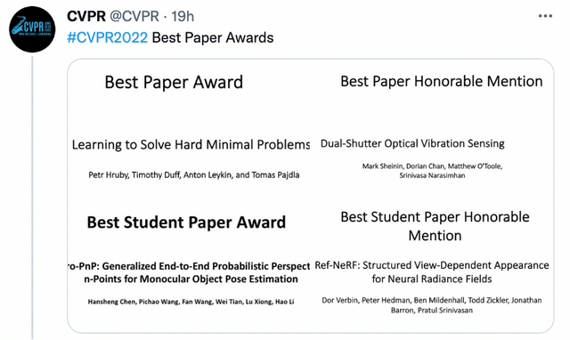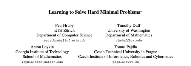 在今年,获得CVPR最佳论文奖的是苏黎世联邦理工学院、华盛顿大学、佐治亚理工学院、捷克理工大学合作的《Learning to Solve Hard Minimal Problems》。这篇论文提出了一种在RANSAC框架下求解困难几何优化问题的方法。原来的几何优化问题放宽会产生具有许多伪解的最小问题,而这篇论文提出的方法避免了计算大量的伪解。