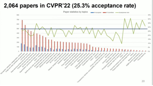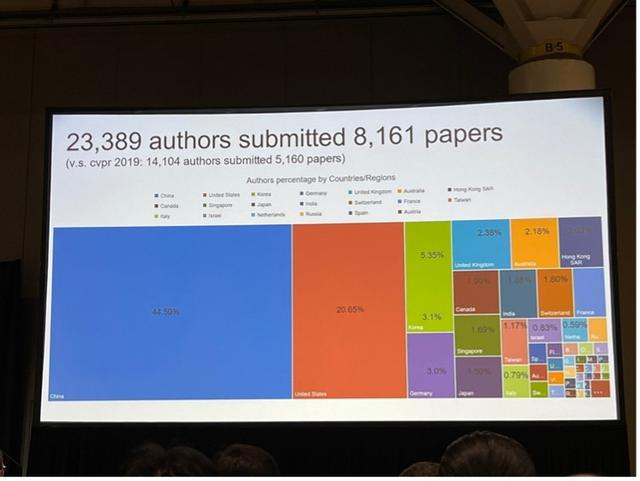 CVPR 2022共收到了来自23389名作者共8161篇投稿,相比2021年的7093篇增长15%。其中,来自中国大陆的作者投稿数最多(44.59%),美国以占比20.65%位列第二。