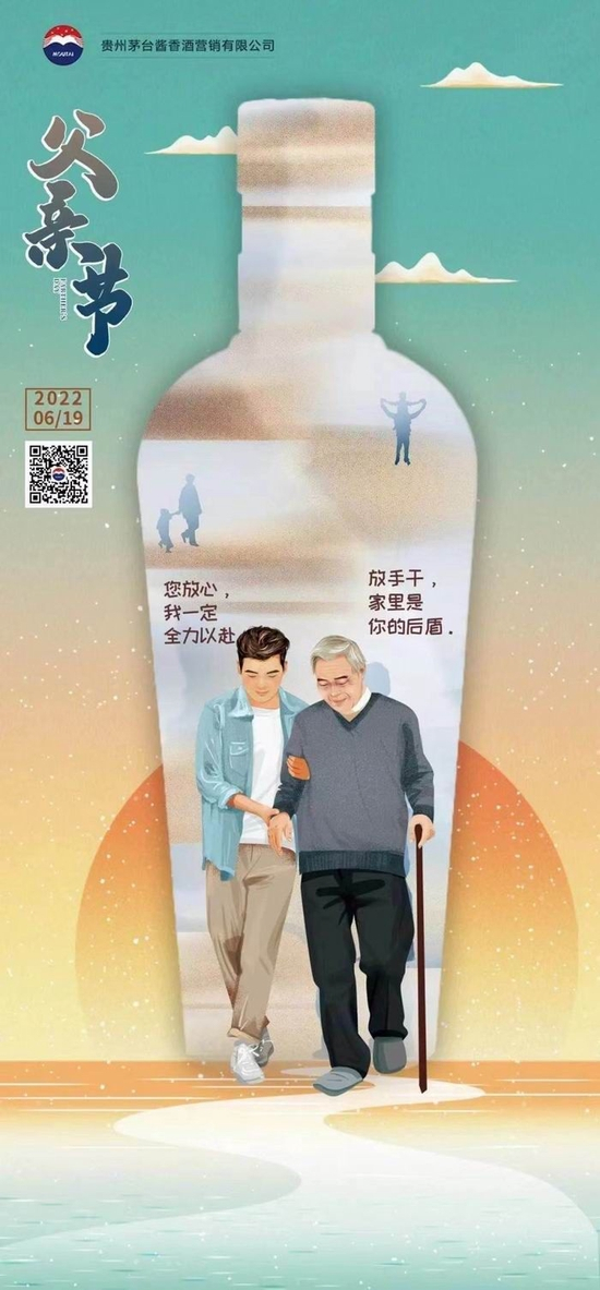 茅台的海报上有一个变形的酒瓶,酒瓶上从上到下分别是反映了父子共同成长的片段,中心画面是儿子搀扶着已经头发花白的父亲向前走,对话体现了代际之间的传承。