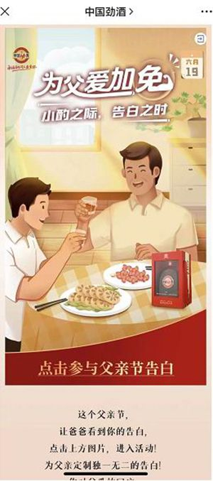 劲酒用H5发起了“父亲节告白”活动,通过简单地操作可以生成印有劲酒标志的专属海报送给父亲。
