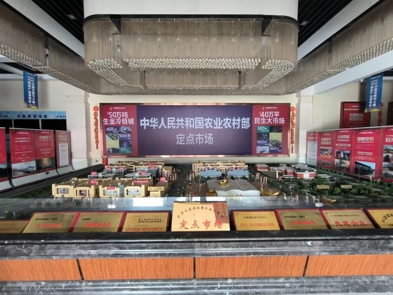 进入营销中心大厅,只有一名保安人员在内。大厅正中央沙盘后墙上,写着“中华人民共和国农业农村部定点市场”几个大字。