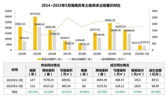 据中国土地市场网数据显示,今年1~5月份,海南全省一级市场土地供应为4315.32亩,同比下滑42.29%;成交3155.52亩,同比下滑32.78%。土地出让成交金额减少,累计成交58亿元,同比下滑35.2%。