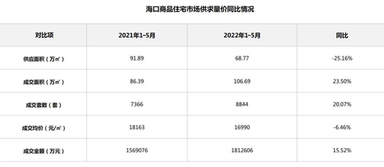 今年1~5月份,海南省商品住宅供应面积182.32万平方米,同比下跌48.98%;成交面积320.26万平方米,同比上涨0.18%,成交均价18751元/平方米。