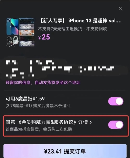 作为商品出售,消费者有权要求退货,但在B站《会员购魔力赏&服务协议》用户须知中,第一条即为:“魔力赏商品不支持7天无理由退货”。