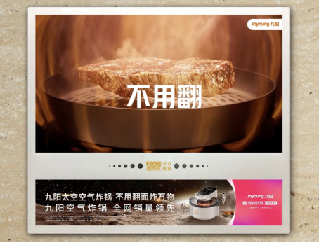 疫情影响之下,空气炸锅忽然“C位出道”,然而一夜爆红也难以掩盖行业长期以来的“技术壁垒低”、“竞争红海”等困境。尽管九阳已是大品牌,但在新品类中要脱颖而出也并非易事。在“618”来临之际,九阳开启新一轮营销攻势,将产品“不用翻面”的差异化优势点通过分众在电梯口反复强调。