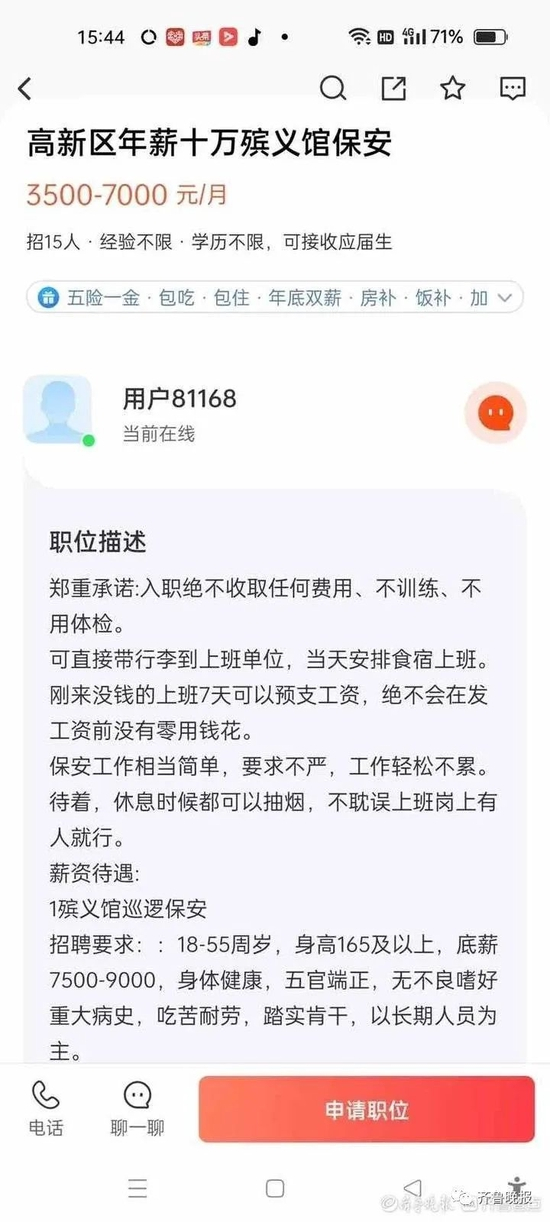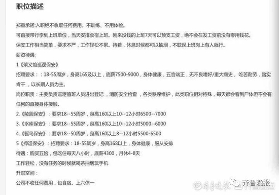 记者在58同城搜索发现,河南长保公司目前仍发布着一条保安招聘信息,有“五险一金、包吃包住、年底双薪、房补、饭补、加班补助、免费发放被褥、自由轻松可带手机、不晒不累可带朋友”等关键词,职务描述中更是有底薪7500-9000元等信息。
