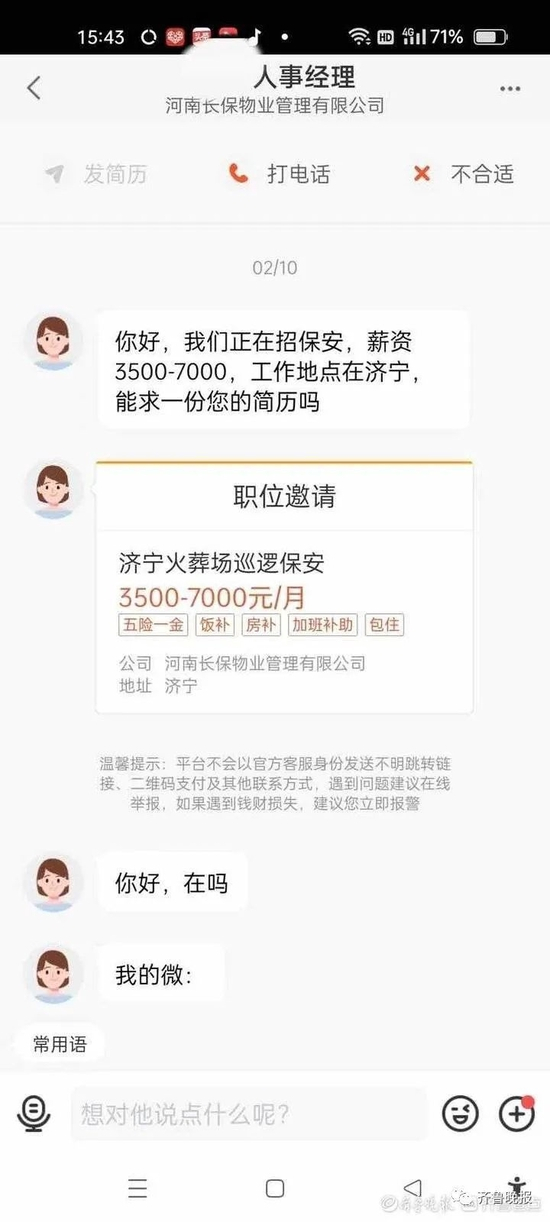 根据小王提供的联系方式,6月29日下午,记者先联系到了河南长保公司的人事经理。不过对方表示,自己并非该公司人事经理,只是前段时间替这个公司招过人,“我现在已经不干招聘了,其他情况我不清楚。”