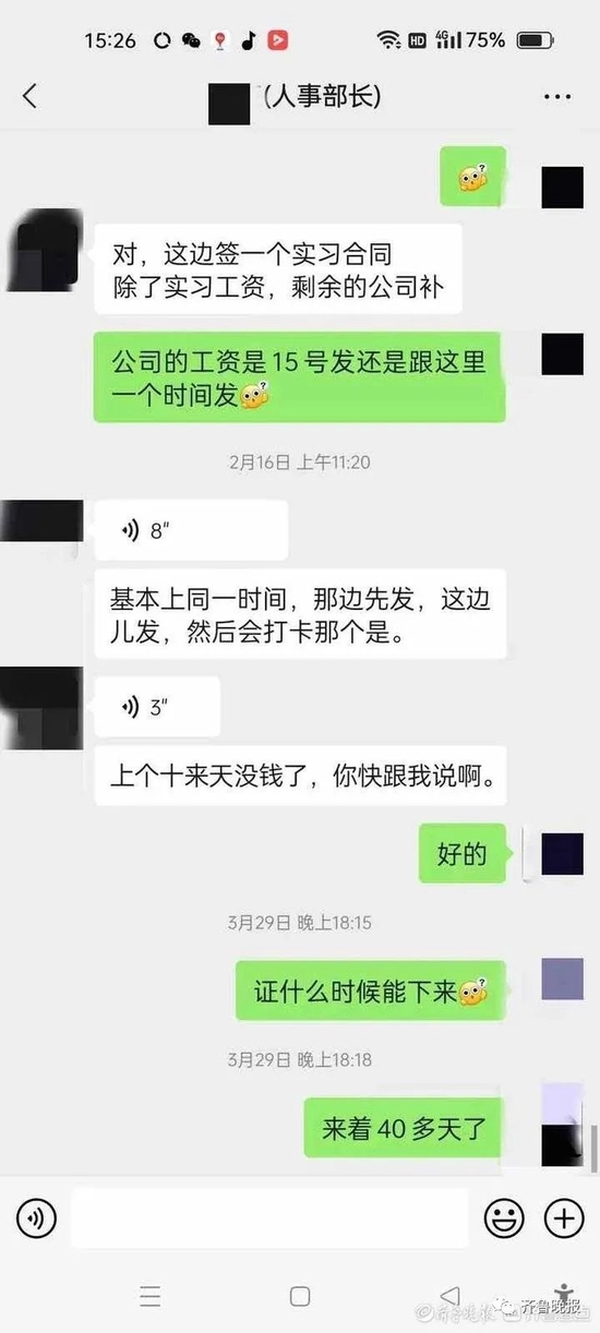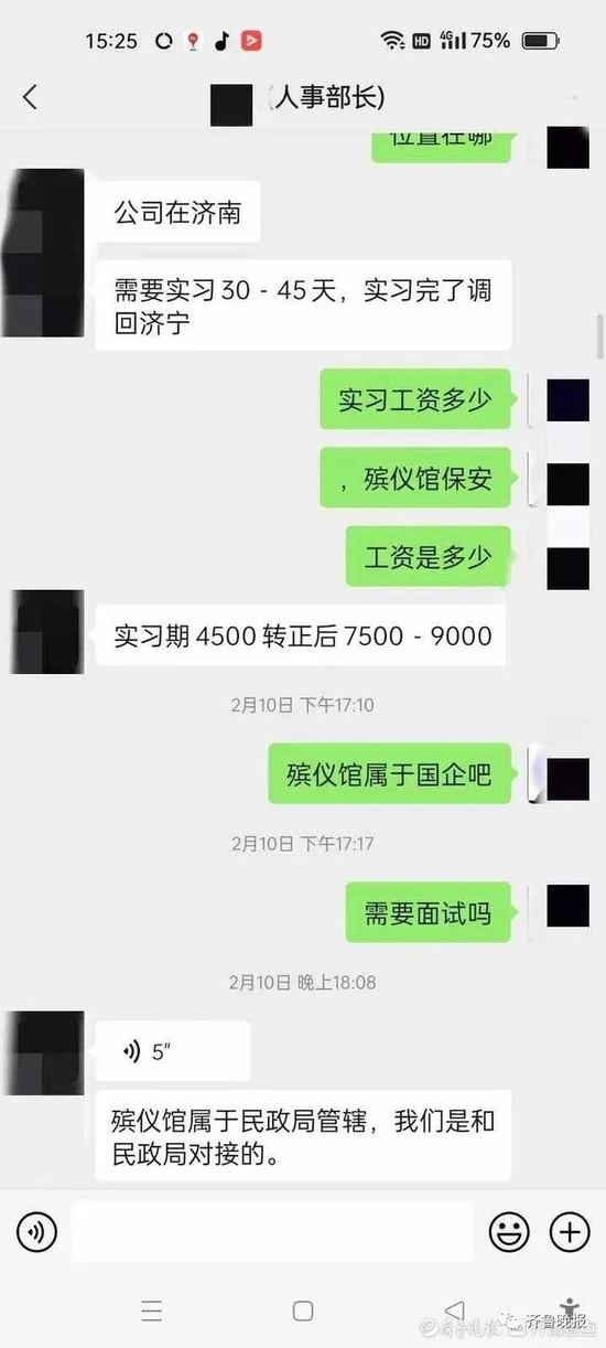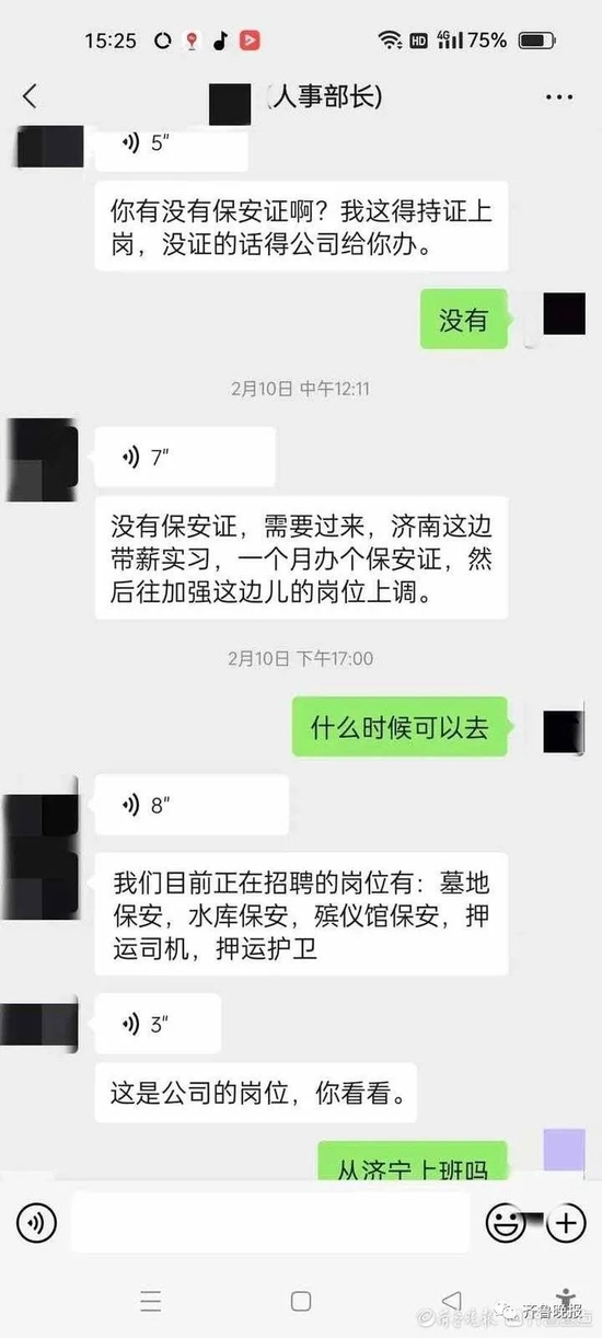 微信上,该人事经理在了解完小王的基本情况后,问他有没有保安证。小王回答“没有”。该人事经理随即表示,需要先到济南带薪实习一个月左右,同时办理保安证,之后再给小王安排他老家济宁的岗位。实习期间的工作为4500元,转正后工资为7500-9000元。