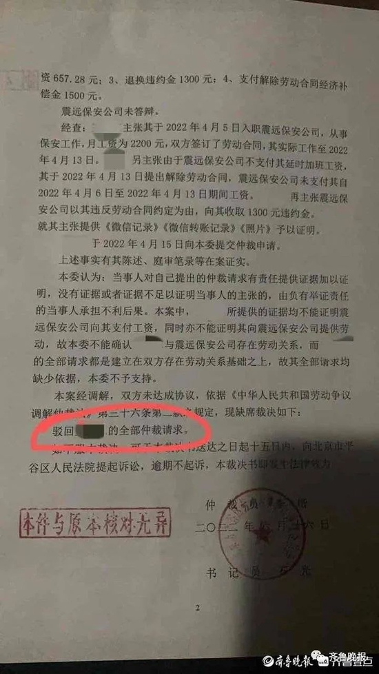 “在济南和在北京签的两份合同都是一式一份的,我手里并没有。”小王告诉记者,济南合同里提到实习工资为每月6000元,北京合同里的月薪却是2200元,且如果在拿到保安证之前离职,需要交2000元违约金。