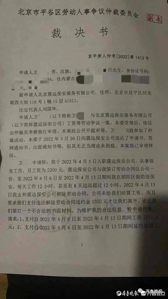 “劳动部门建议我们走诉讼途径。”小卫告诉记者,如果走诉讼途径,他们胜诉的可能性很大。可是走诉讼途径既耽误时间,又要花很多钱,“我们在北京等了两个月,花了一万多块钱,等来一个不好的结果,实在耗不起了。”小卫说,拿到劳动部门的裁决书后,他和朋友第一时间回了老家。