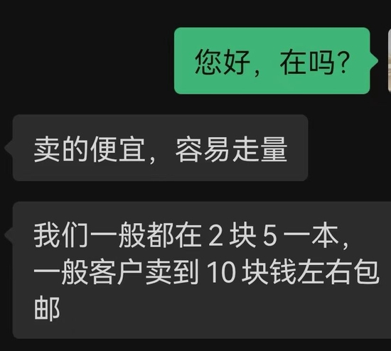 盗版书具体是如何定价的?记者伪装成进货商,联系到一家盗版书供应厂家。厂家向记者展示了进货渠道,其中大部分图书以2-3元/本的成本价格售卖。该厂家告诉记者,盗版书都是走批量渠道,卖的越多,赚得越多,不建议把价格定得太高。一般成本价为2.5元的图书,卖出的售价会定为10元一本包邮。