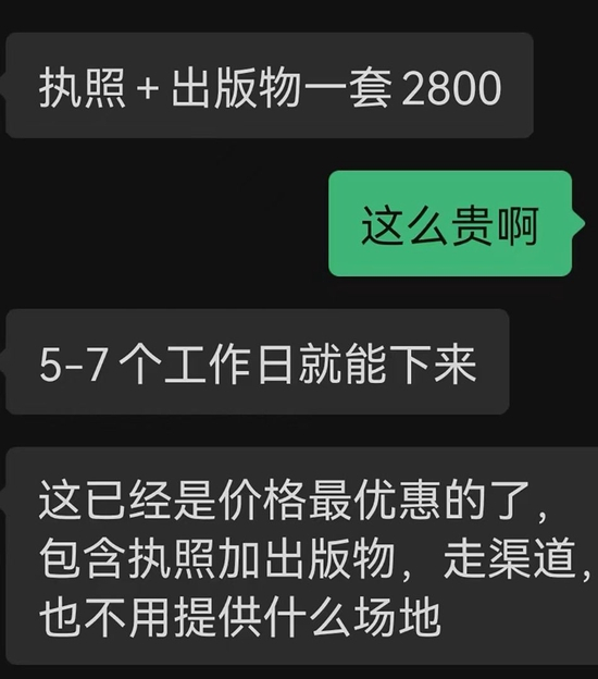 大部分盗版书商家未获得出版物经营许可的资质,如何通过平台审核?澎湃新闻记者了解到,在盗版书猖獗背后,代办互联网平台《出版物经营许可证》也成为产业链的一环。某商家告诉记者,如今代办一套许可证的价格为2800元,只需要提供身份证等信息,即可在5-7天内拿到证件,在网上开店售书。