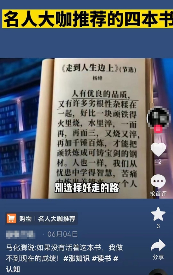 在某短视频平台上,能看见用编造的马化腾语录推销《活着》书籍