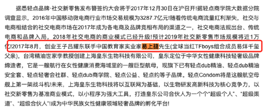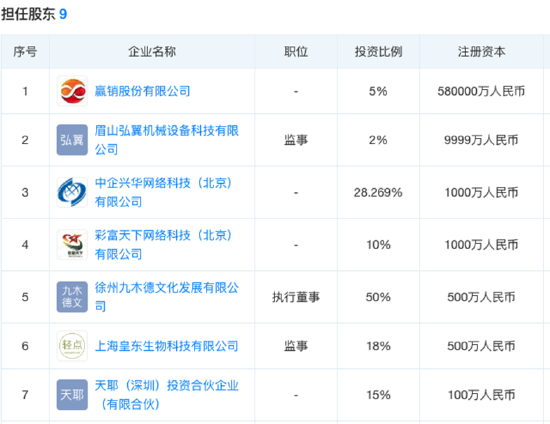 值得注意的是,在赢销股份有限公司中,易上捷虽然仅持股5%,但该公司注册资本高达58亿元,也就是说,易上捷个人认缴金额就达到了2.9亿元。而该公司的法人与前述诚信天下的法人均为同一人,名为李俊山,公开信息显示,李俊山为创业家投资有限公司董事长。