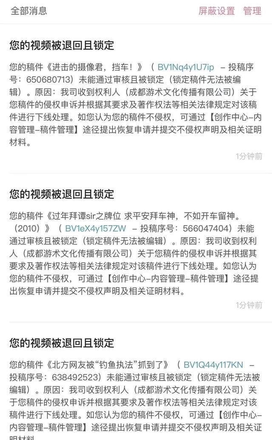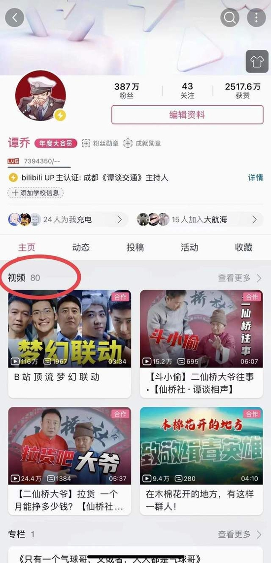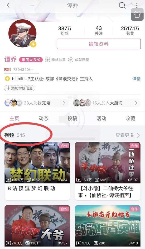 据介绍,相关公司应该是以知识产权方面的理由要求他把视频下架,但具体原因尚不清楚。谭乔表示多次收到平台发布的视频退回且被锁定的通知,上游新闻在B站谭乔个人页面看到,其发布的原创视频仅剩80个,均为二次创作视频,且不少视频都打有“合作”的标签。据他介绍,此前视频有345个。谭乔在最新发布的视频中称,不仅如此,还有上万个二次创作者编辑的爆款视频也被投诉下架。