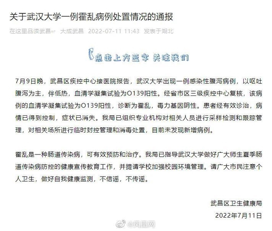 今天上午“大成武昌”微信公众号发布消息,武昌区卫生健康局通报,7月9日晚,武昌区疾控中心接医院报告,武汉大学出现一例感染性腹泻病例,以呕吐腹泻为主,伴低热,血清学凝集试验为O139阳性。经省市区三级疾控中心复核,该病例的血清学凝集试验为O139阳性,诊断为霍乱,毒力基因阴性。