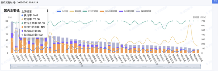 来自航班管家的最新数据显示,截至2022年7月13日9:30,上海浦东取消航班量(含提前取消)804班次,取消率为72.0%上海虹桥取消航航量(含提前取消)480班次,取消率为63.7%。