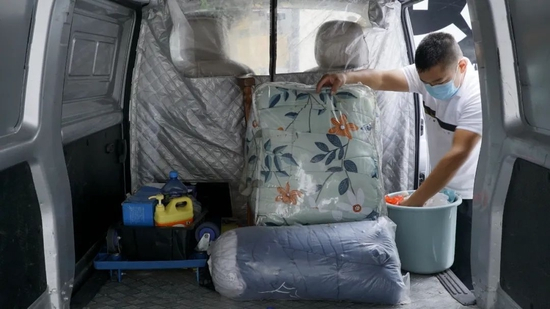 图片说明:林师傅出车都会在车厢备好被子、桶等生活物品