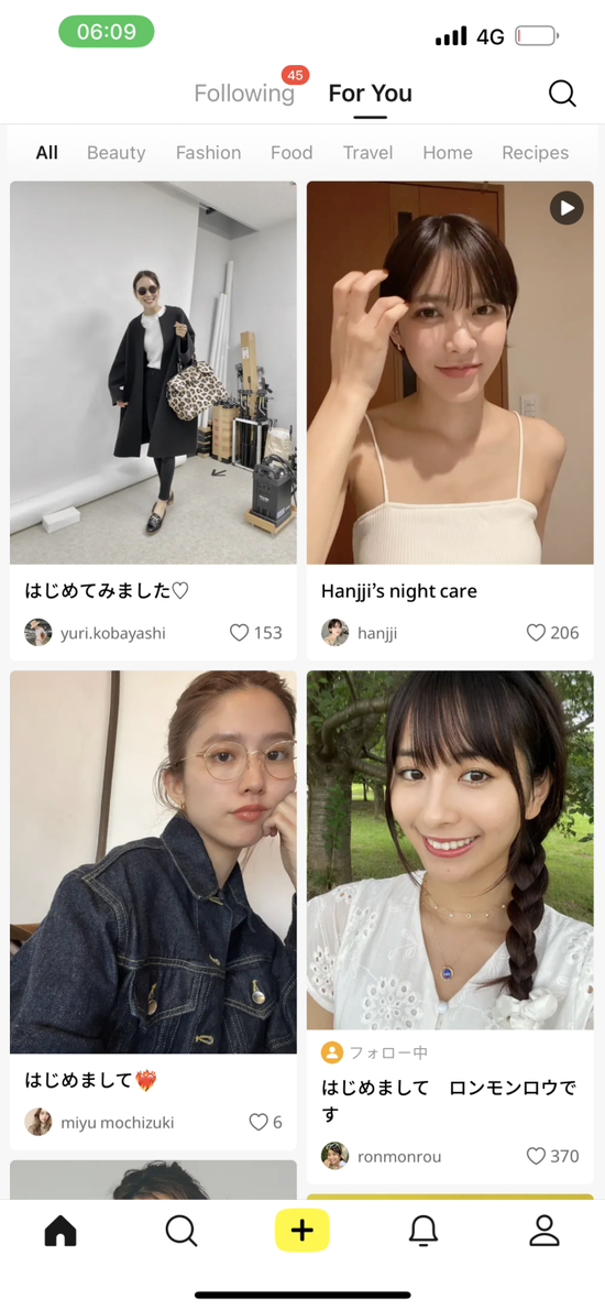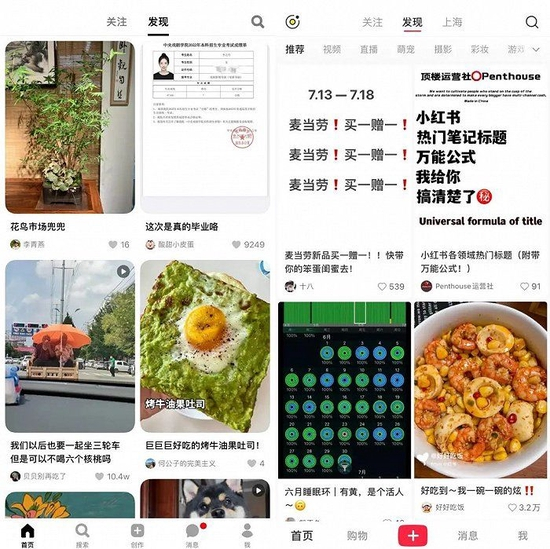 在UI页面设计上,可颂与小红书都是双列瀑布流展示,单屏呈现4个图文或视频内容,顶部跟底端的Tab栏顺序也基本一致。