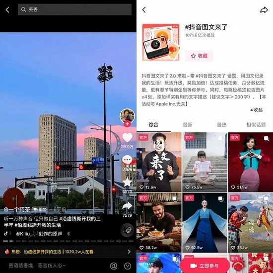 在话题互动端,抖音上线了适合以图文形式传播的话题,给予流量奖励和官方指导。截至目前,主话题#抖音图文来了#播放量达1071.5亿次。