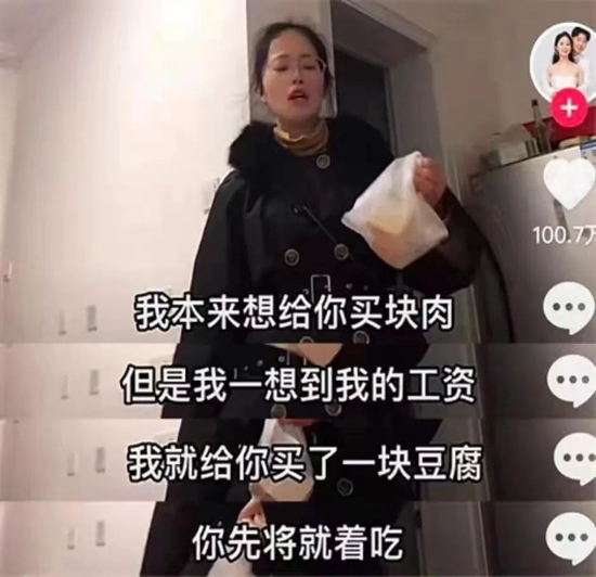 我俩平时不逛街不下馆子,平时就在家里待着,没有娱乐活动,休息的时候都是在家做饭。我老婆被降薪那天,自己偷偷在公司哭过了,下班回来想买肉,结果只给我买回来一块豆腐,我觉得有点好笑,就给她拍下来上传了。我们用短视频记录日常,就是从这条视频,开始有人关注的。那条视频后,我们的生活又恢复平静。几个月后的今天,又被互联网捞起来关注。