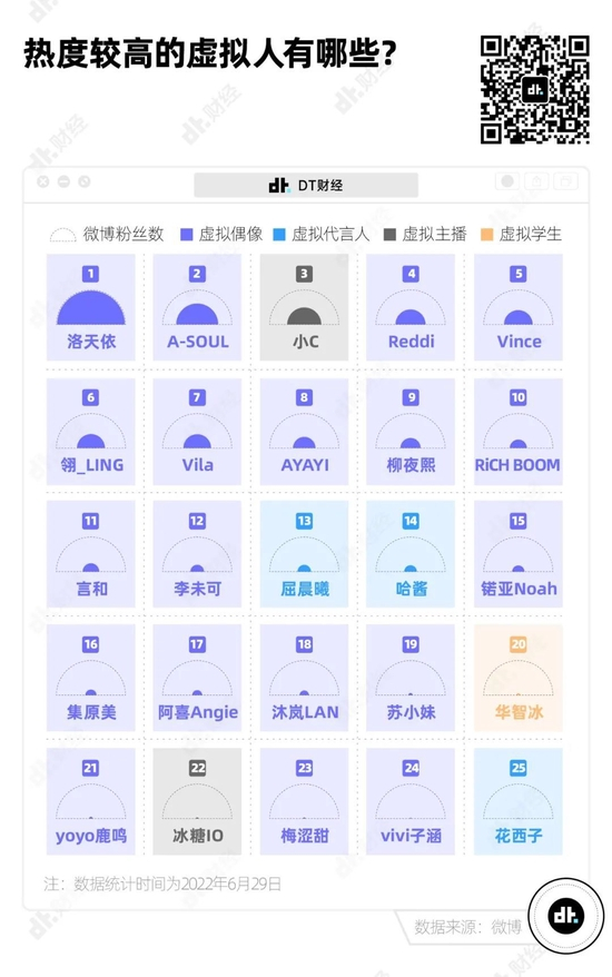 其中,大部分活跃的虚拟人定位为虚拟偶像。微博粉丝数量前25位的虚拟人中,19位定位为虚拟偶像。