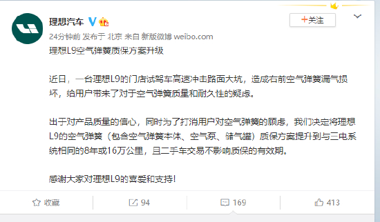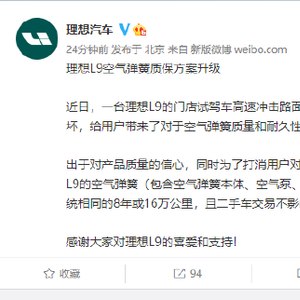 理想回应试驾车空气悬架断裂:将理想L9空气弹簧质保方案提升到8年或16万公里