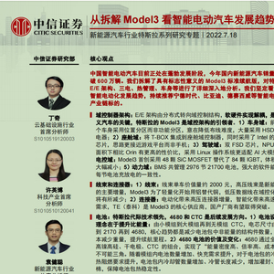 继海通国际发布比亚迪“元”的拆车报告之后,中信证券今日发布的《从拆解Model 3看智能电动汽车发展趋势》研究报告引发市场不小关注。