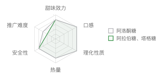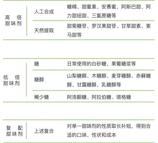在实际的食品添加场景中,代糖一般不会单一使用,而是多种复配,以达到对蔗糖更还原的口感、多种情景下更好的稳定性以及对总体成本的合理控制。比如赤藓糖醇的甜度为蔗糖的70%,单一使用赤藓糖醇可能成本高、口味淡,因此一般加入极少量高倍甜味剂。比如糖精有后苦味、甜蜜素口味微苦且耐酸性稍差、甜菊糖苷有一定草腥味、安赛蜜糖甜味去得快后甜不足、阿斯巴甜前甜不足且在酸性饮料中的稳定性较差。
