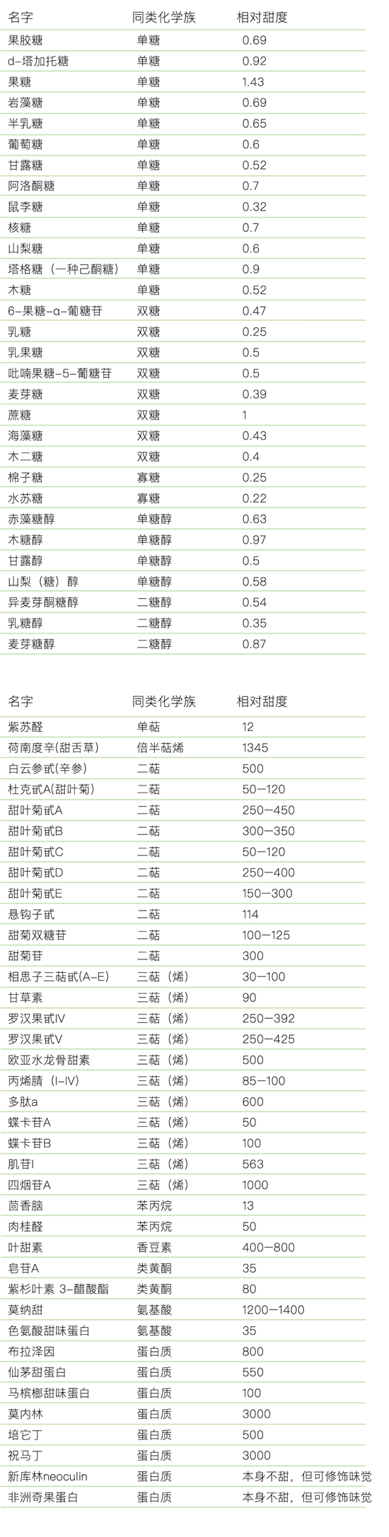 其中除了糖之外的,便是所谓“代糖”。“代糖”的本质是“代甜”。我们希望使用其它甜味剂来实现甜味,同时又能减少过量的糖摄入带来的健康问题。