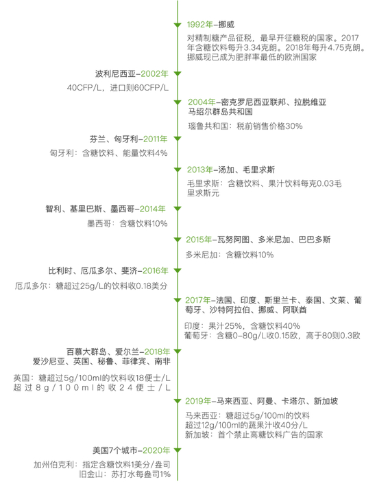世界卫生组织自2016年起,多次呼吁各国政府对含糖饮料至少征收20%的特别税。目前全球有50个左右的国家征收糖税。糖税增加的公共收入可以直接用于健康或医疗支出,主要是解决糖尿病、肥胖和龋齿。在此政策趋势引导下,寻找能给人类带来甜味感官但又没有糖的害处的甜味剂来替代糖,成为了全球食品企业共同的目标。企业在糖税的刺激下,通过对上游科研的支持、中游生产的投入和对下游消费者的教育,客观上实现了代糖产业的高速发展。