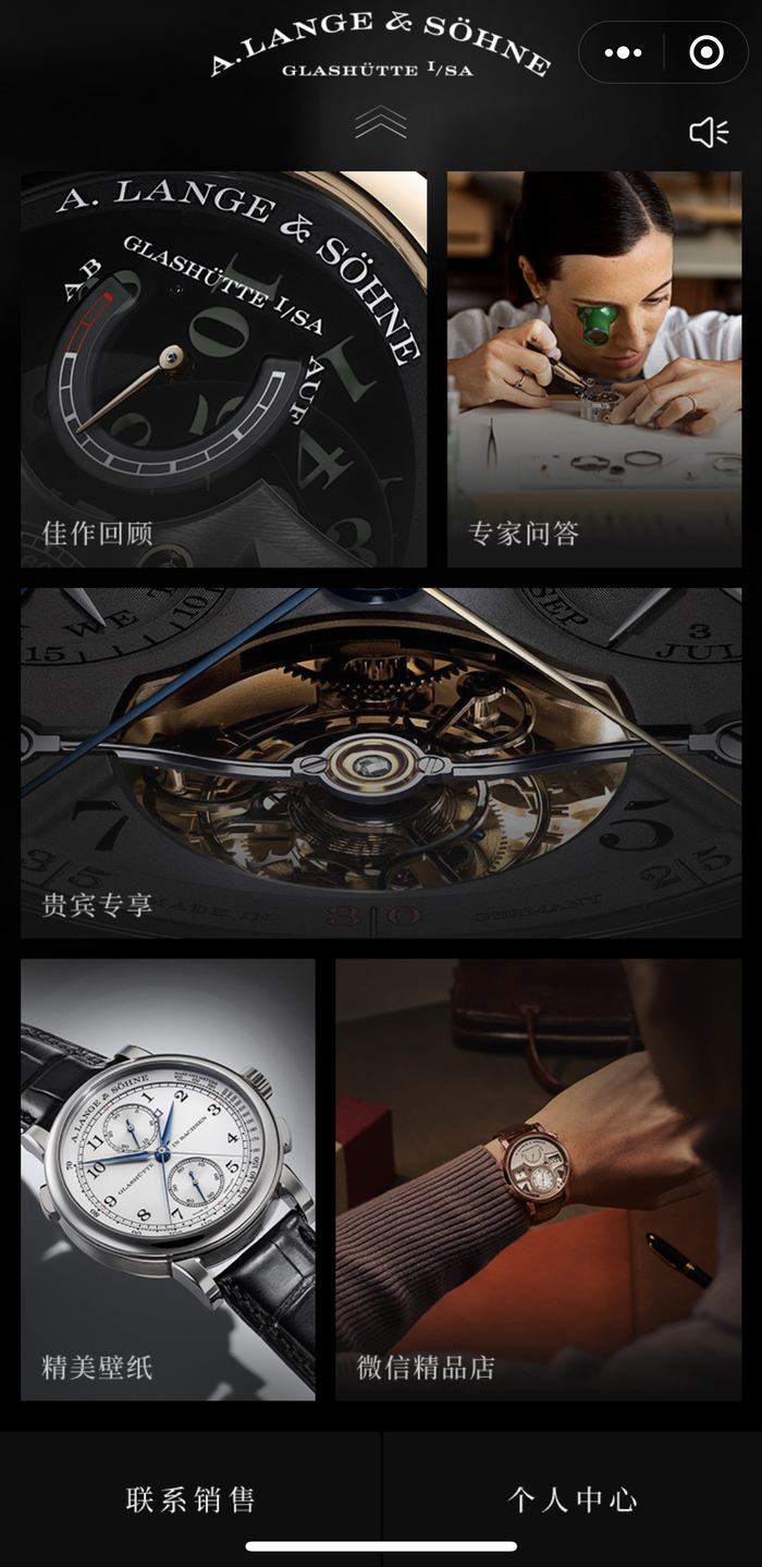 在德国高级制表品牌朗格A. Lange & Söhne的微信小程序内,在常规的品牌资讯和产品专区之外,还有专为品牌客人设置的“贵宾专享”区域。朗格的贵宾进入这个区域后,可以在线获得更加详细的腕表养护指南和复杂计时介绍。在复杂计时介绍的部分,朗格通过精美的数字内容,近一步拆解品牌核心产品和引以为傲的技术,并引入业内专家的点评长文,好似打造一个线上私密分享会。