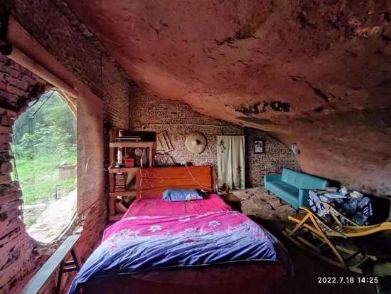 即使是在倡导隐居的“隐居吧”,闵亨才的举动已经让很多人感到不解。他住在山洞,一个自称为冬暖夏凉的“宝地”。2022年过完春节,他开始用一大货车的石砖沿洞穴建房。洞穴的石壁是天然的墙,只需把砖垒起来,糊好水泥。外墙做好了,一个家就基本成型了。