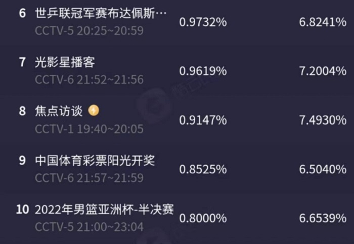 根据酷云APP的数据,7月23日(周六)晚间,CCTV5收视最高的是世乒联冠军赛布达佩斯站男单决赛,直播关注度0.9732%,市占率为6.8241%,全平台排名第六。
