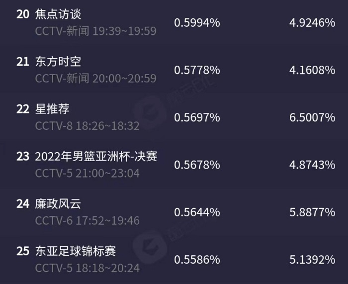 而在7月24日(周日)晚间,在WTT布达佩斯站落幕且CCTV5并未排播田径世锦赛的情况下,东亚杯的收视数据进一步走低,直播关注度从0.6582%下降至0.5586%,市占率下降超过1.5%。