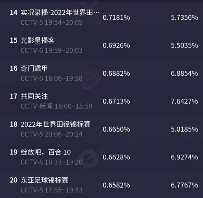 东亚杯的收视数据十分惨淡,甚至比不上2022年田径世锦赛的实况录播回放(收视率全平台排名第14),收视率仅排名第20。