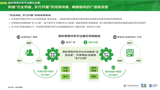 报告展望开放平台模式远景,将呈现消费侧“客群广、场景广、诉求广”,供给侧“品类广、品牌广、地域广”特征,参与各方在流量、履约、服务创新和赋能的合作上持续深化,即时零售开放平台将兼顾服务广度和深度,实现多方共赢。