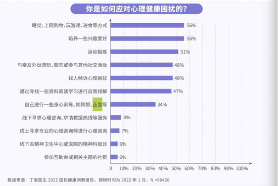 如同加强锻炼,以对冲不确定性带来的精神层面的恐惧感一样,国内心理疏导的需求在疫情之下也在激增。丁香医生2022年1月发布《国民健康洞察报告》显示,在60420位受访者“如何应对心理困扰”的问题下,选择“自己进行一些身心训练,如冥想、正念等”的受访者占比34%。