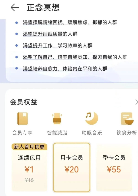 此外,华外运动健康APP内还有其他一些付费的冥想精品课程:《28天晨间唤醒正念练习》(原价39元,会员价29元)、《科学正念冥想》(原价99元,会员价79元)、《10天放松冥想》(原价59元、会员价49元)。开通会员的条件是月卡20元,季卡55元。