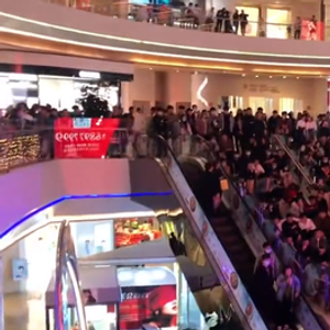 2021年EDG夺冠当晚,观众聚集在商场观看 图片来源:视频截图