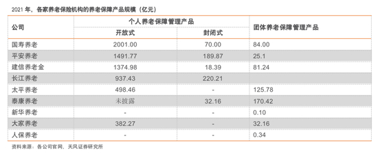 据天风证券研报指出,2021年个人养老保障管理产品业务市场份额排名前四的机构为国寿养老、平安养老、建信养老和长江养老,其养老保障产品规模均超过1000亿元,头部集中化效应较为明显。
