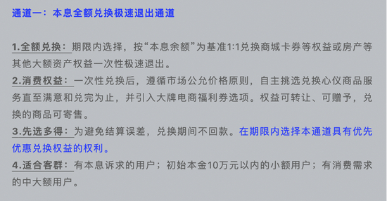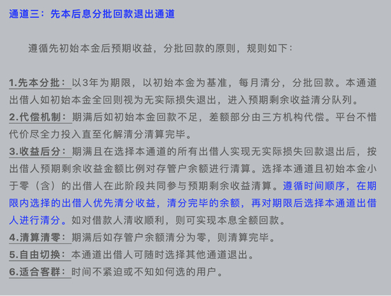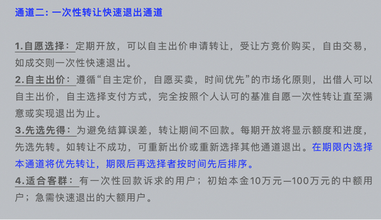 根据该账号2020年12月7日发布的消息,多元退出通道包括:本息全额兑换极速退出通道,一次性转让快速退出通道,先本后息分批回款退出通道。